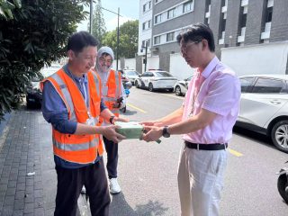 上午 9 点,烈日已当头,公司董事长吴秋根率先行动,前往昆山管线探测项目现场。管线探测工作繁杂且艰巨,员工们顶着烈日,穿梭在道路中。吴总为大家送上精心准备的物资,并强调大家一定要照顾好自己,这样的高温天气,外出作业一定要做好防晒等措施,千万注意安全。